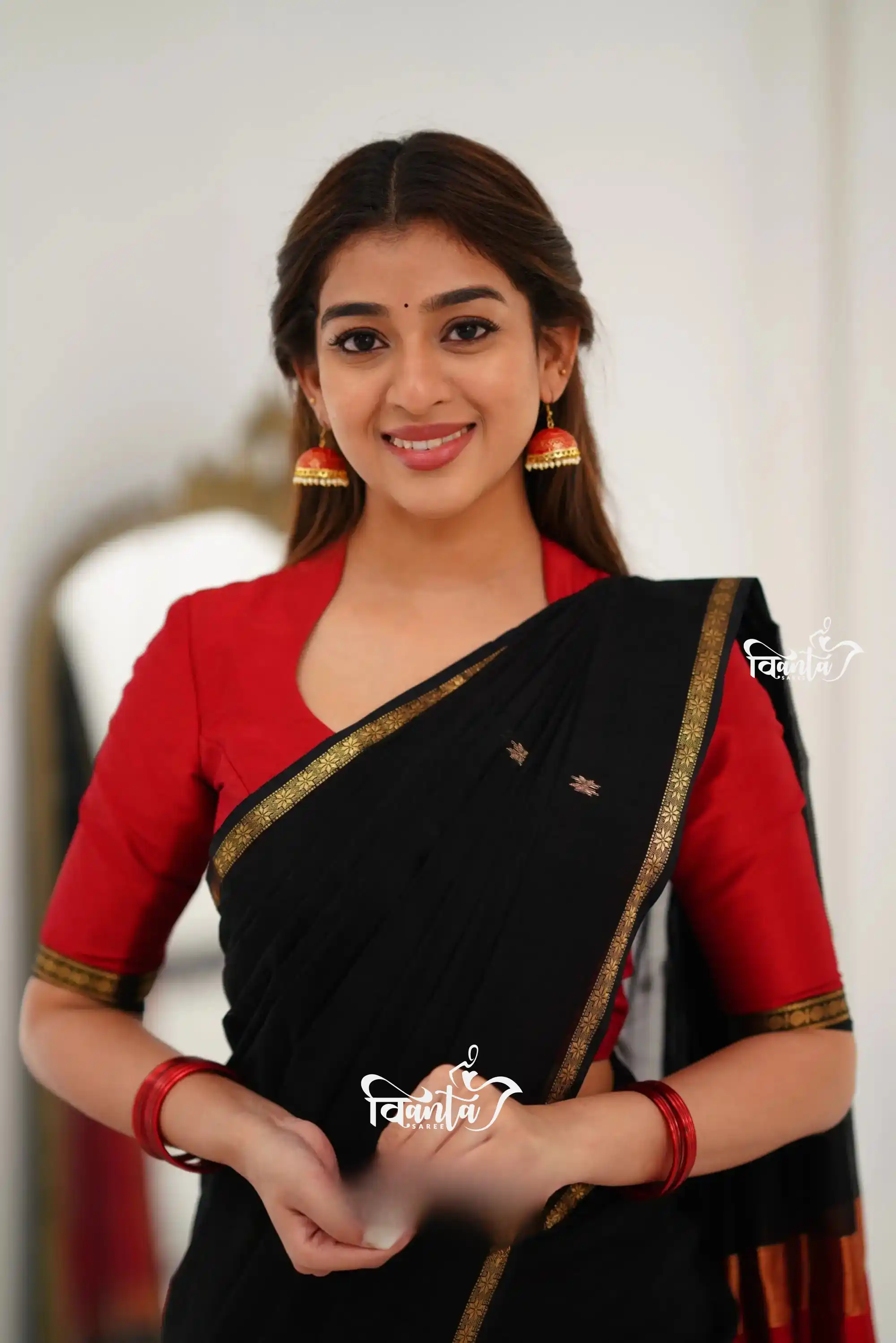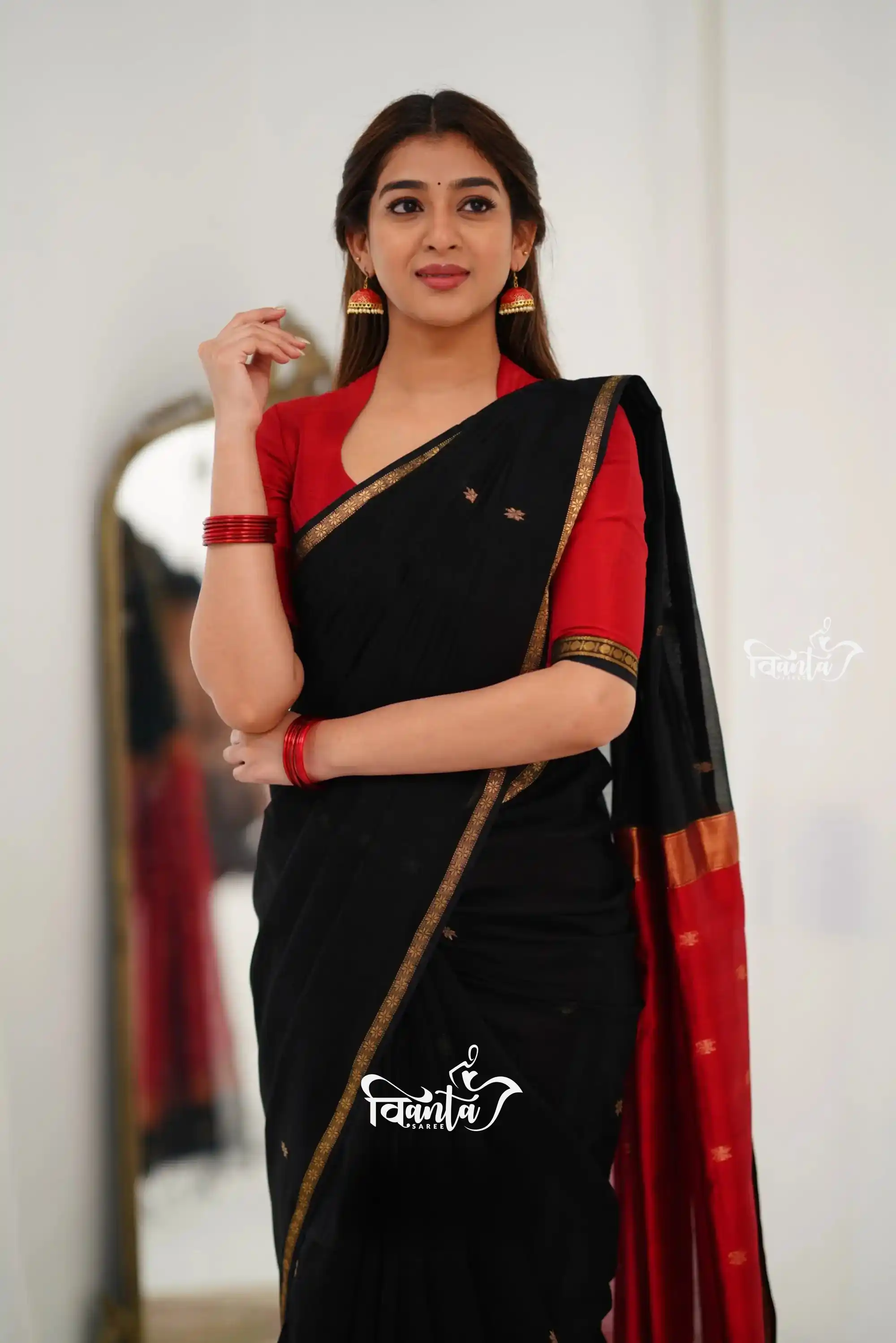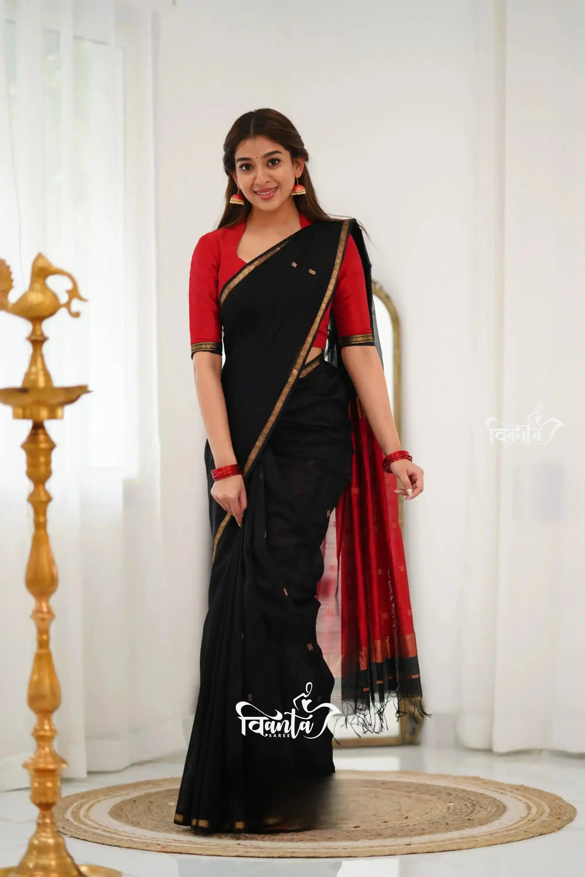 Maheswari Silk Cotton Saree - Black And Maroonish Red