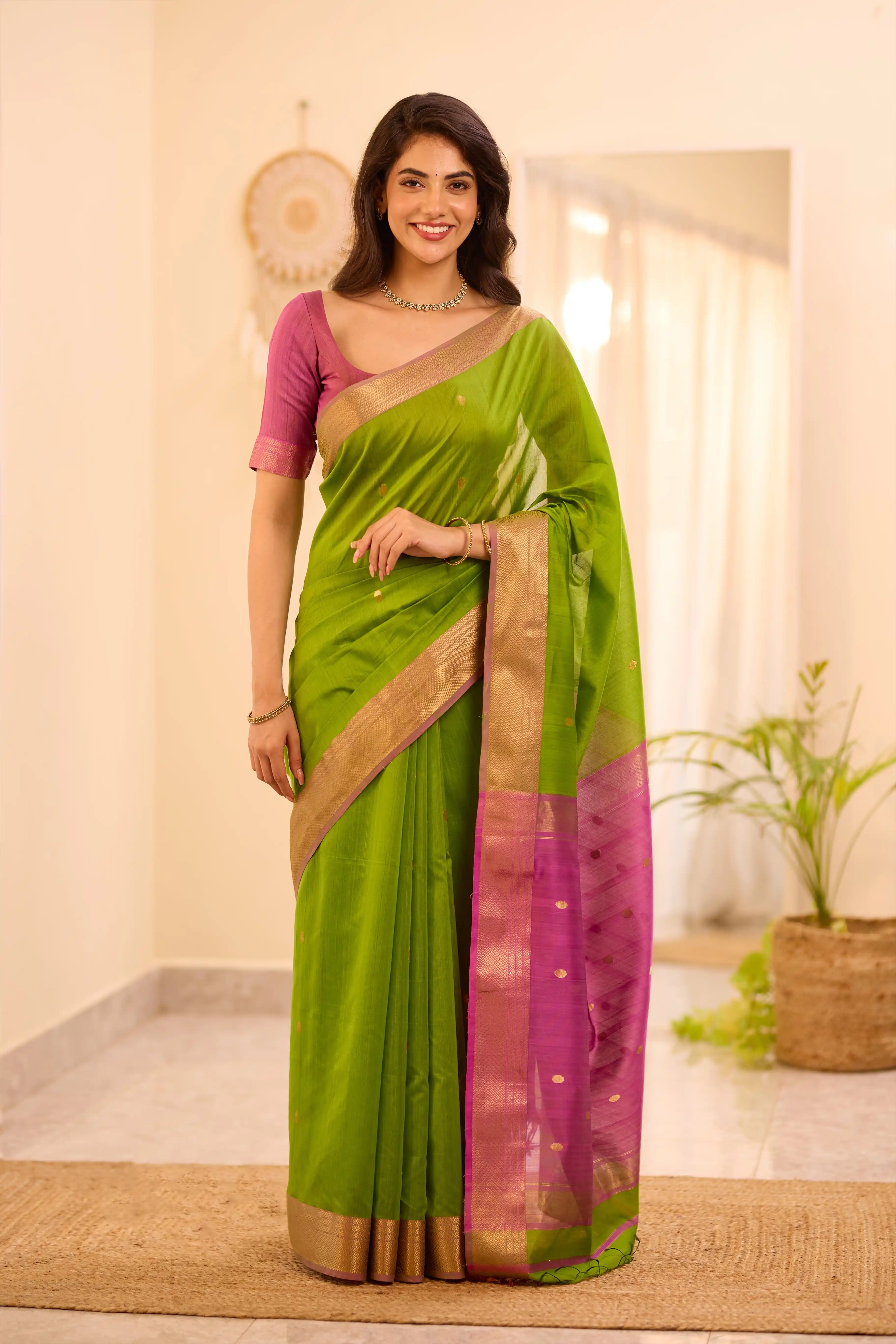 Parrot Green and Pink Maheshwari Silk Cotton Handloom Saree